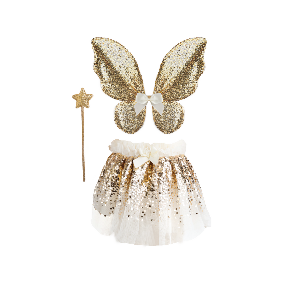 Contenu : 1 jupe à paillettes dorées, 1 paire d'ailes de papillon, 1 baguette magique (3 pièces au total)