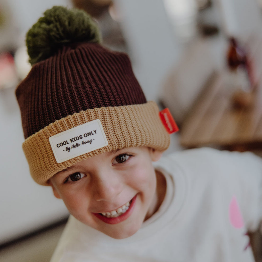 The Hello Hossy Kids Colour Block Pistachio Beanie blends style, warmth, and comfort in a unique brown and green colourway. Fleece-lined and made from organic cotton, it provides a snug yet breathable fit, ideal for outdoor adventures, winter walks, and school runs.