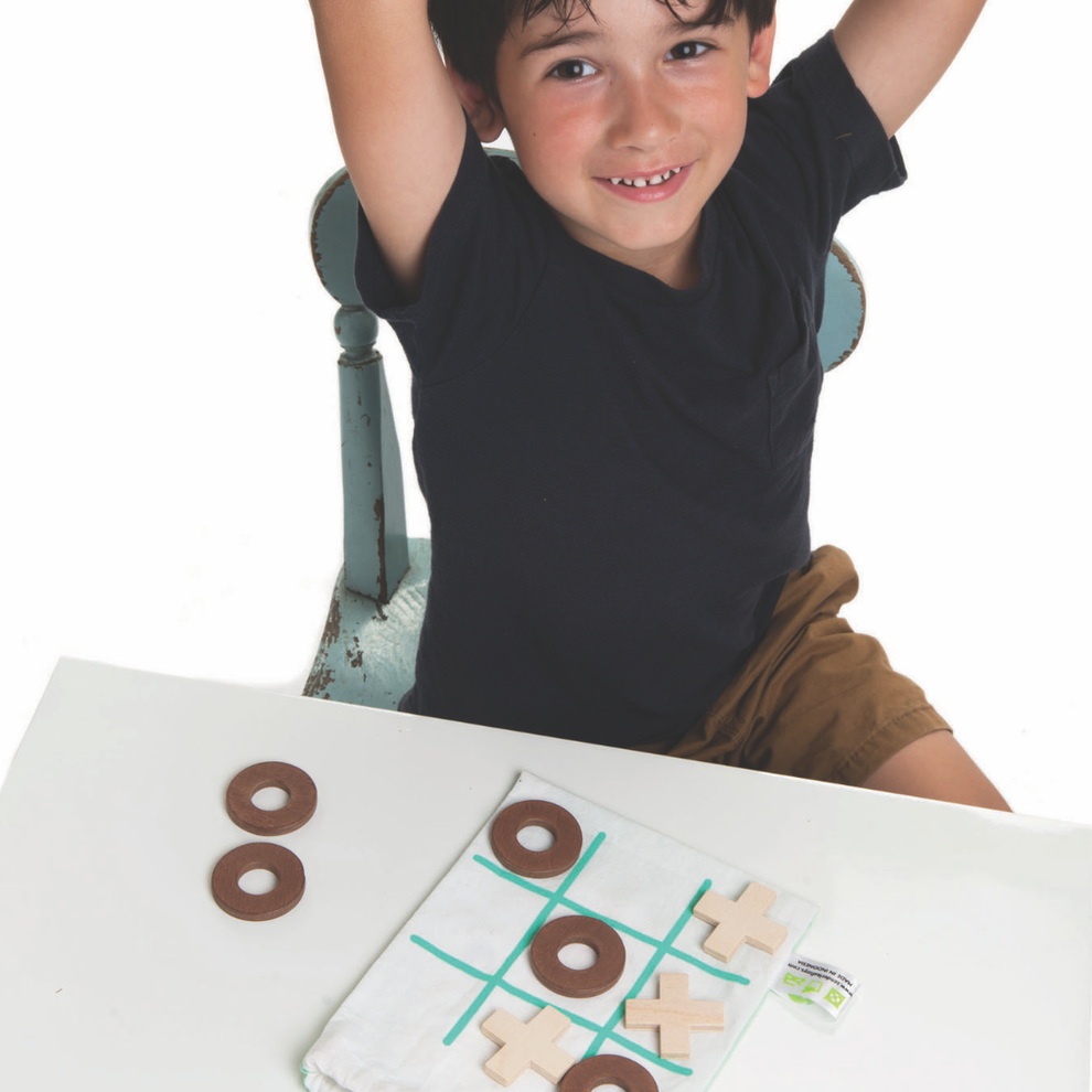 5 wooden crosses and 5 wooden circles with a bunny drawstring bag, turn the bag over to play Tic tac toe, or Noughts and Crosses depending on where you live!